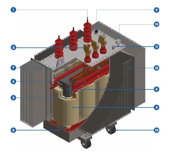 Oil-immersed transformers are divided into two groups: hermetic and with expansion tank. In both types, the transformer windings are completely immersed in oil. However, in hermetic type oil-immersed transformers, they are sealed to the atmosphere and do not require maintenance. Hermetic type oil-immersed transformers do not have an expansion tank, and the tank they contain is completely filled with oil. Hermetic type transformers are sealed to the atmosphere by factory-set hermetic pressure adjustment. The expansion of the oil is controlled by the elastic and undulating tank structure. The wave walls both conduct heat to the outside and absorb additional oil that expands.